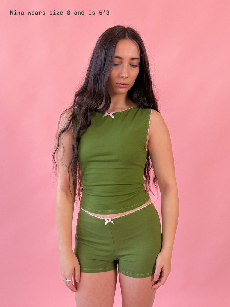 Your all-rounder short in a delicious olive green with contrasting baby pink trim and bow detail. Perfect for lounging, sleeping, warmer days, or under your mini dress to keep you covered.