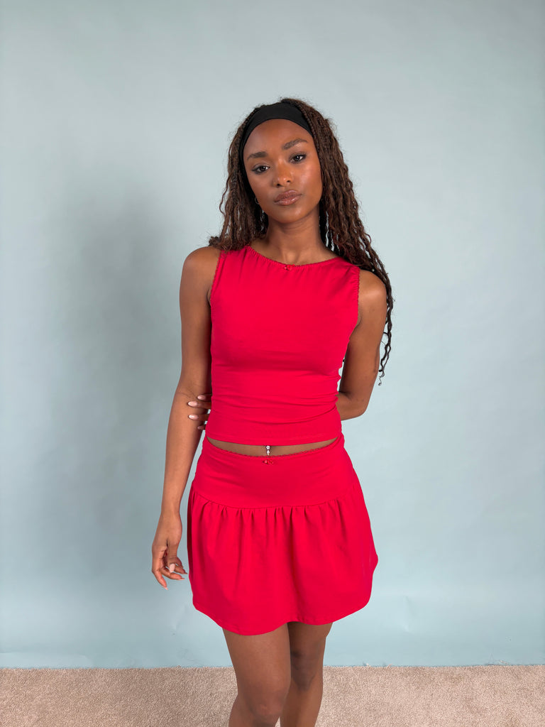 Mini skirt with a gathered tier, in your choice of colour and trims. The perfect companion to your Evie tops!