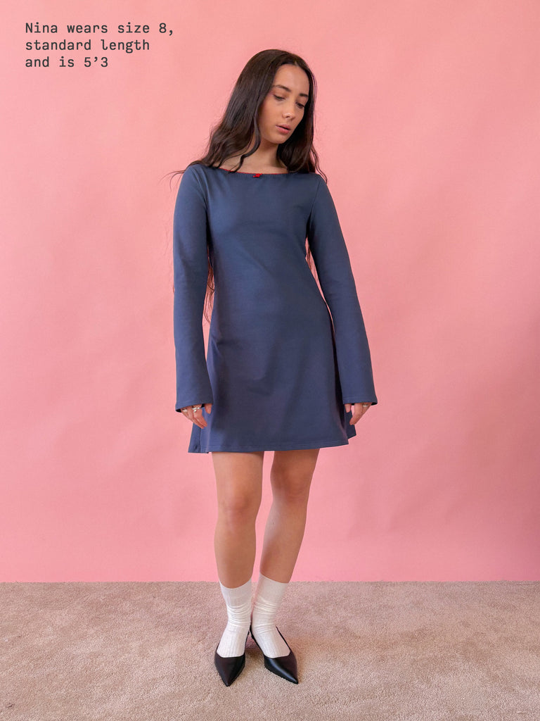A classic, long-sleeve, A-line mini with a boatneck for a flattering fit, in your choice of colour and trims! Made-to-order, ships in approx 3 weeks 🖤