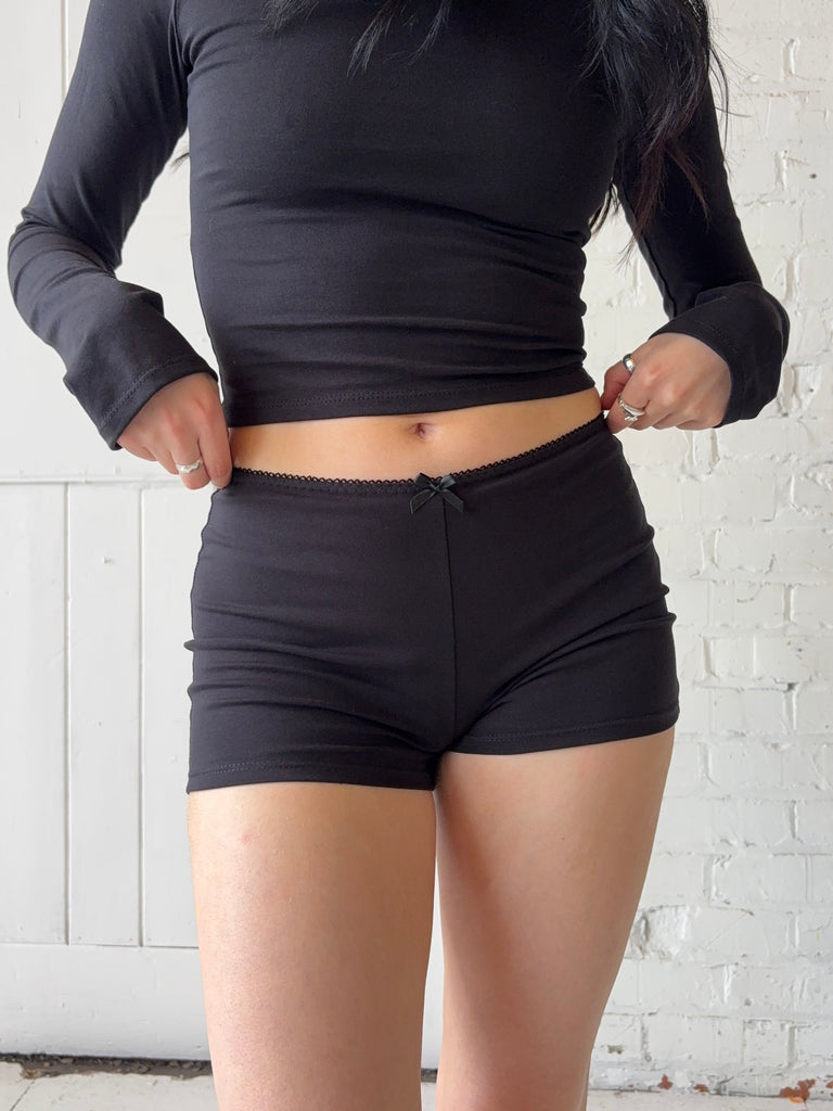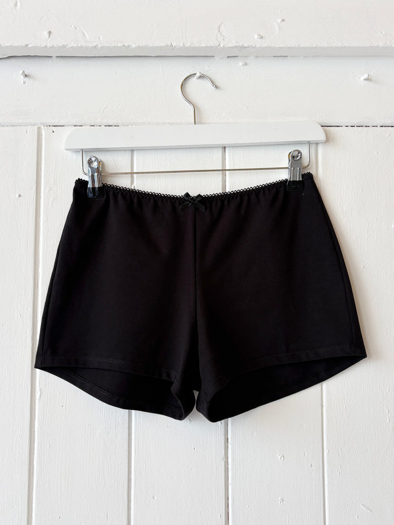 Your all-rounder short! Perfect for summer days, lounging, sleeping or under your mini dress to keep you covered. Made from black cotton jersey with picot trim and a cute bow detail. Pre-made and ready to ship.