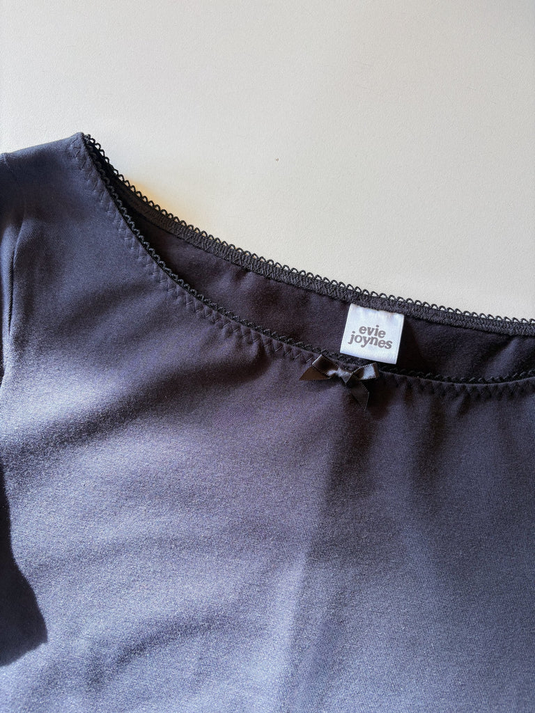 Chic, soft, and endlessly versatile. This black long sleeve mini dress is crafted from buttery soft, stretchy cotton jersey for a smooth, flattering fit. Finished with matching picot trim and cute bow. Ships in 2-3 working days.