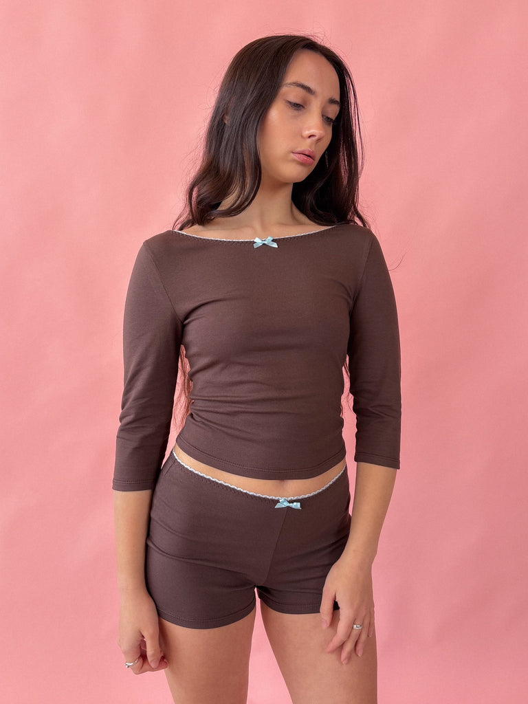 A chic, boatneck 3/4 sleeve top in a slightly cropped silhouette, in delicious chocolate brown with contrasting aqua trims and pretty bow detail.