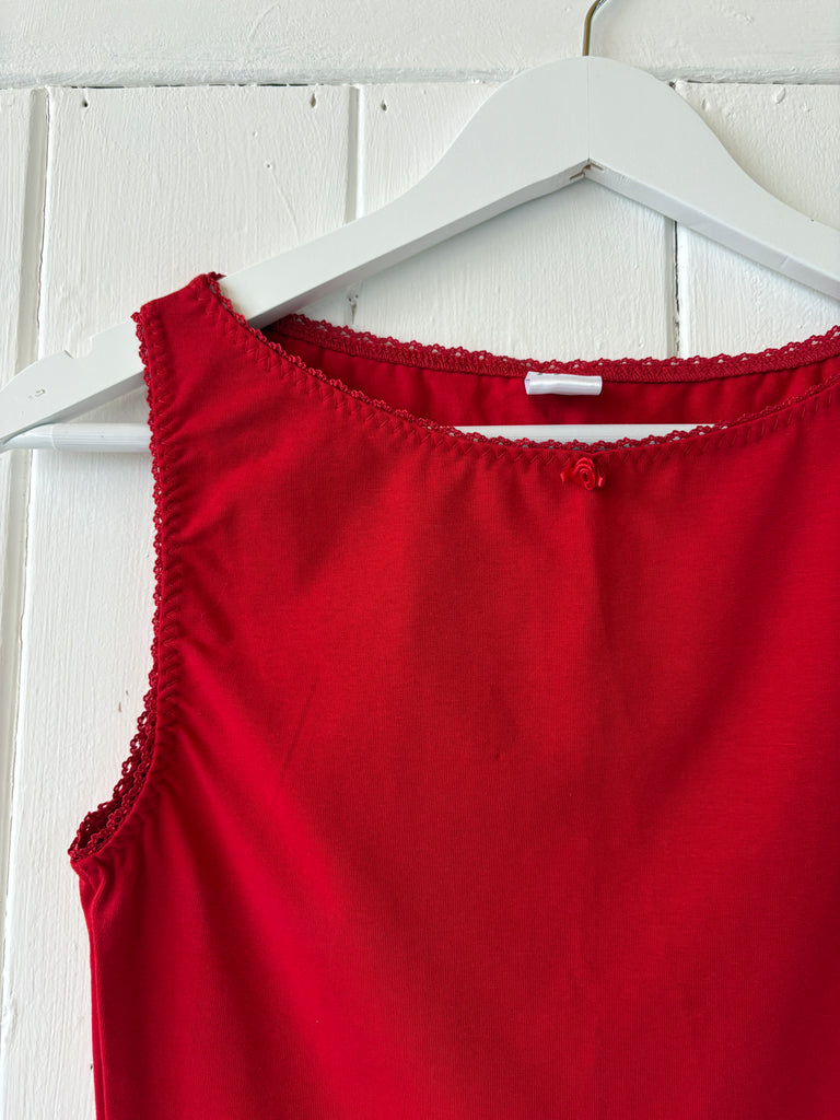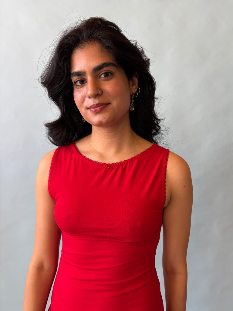 A lady in red! 🌹 Meredith's a chic, sleeveless mini with a rose detail - perfect for day or night. Made-to-order, ships in approx 3 weeks!