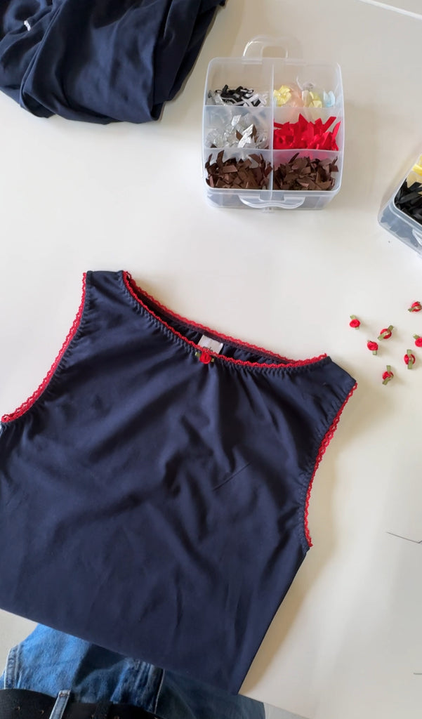 A navy, high-neck tank with red picot trim and rose 🌹 Pre-made and ready to ship!
