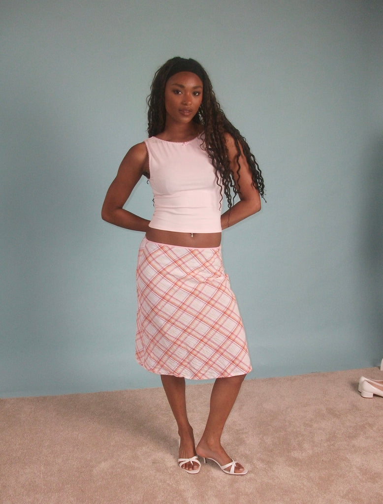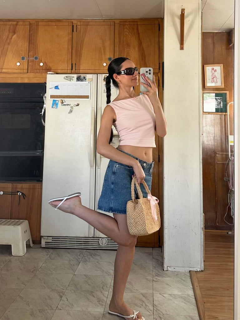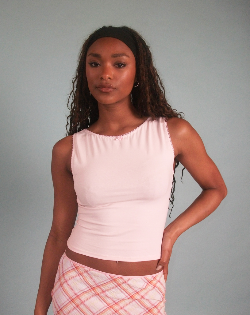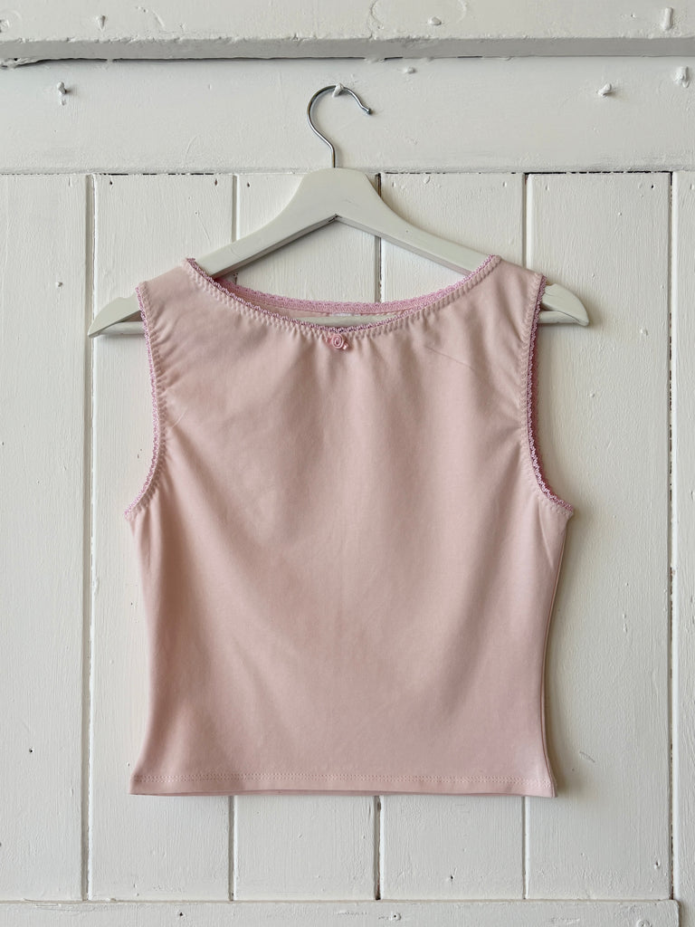 A baby pink boat-neck tank with matching lacy trim and rose 🎀 Made to order, ships in approx 3 weeks!