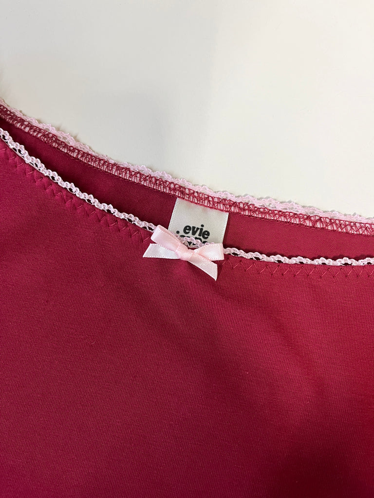 Cute and cosy long sleeve top in wine with a pretty, lacy trim and bow detail at the neck. Made to order, ships in approx 3 weeks.