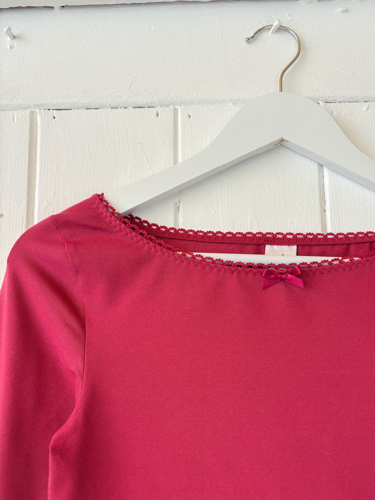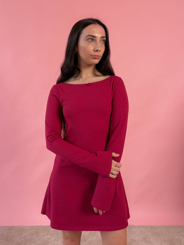 Comfy, cosy and chic. This burgundy long sleeve mini dress is made from buttery soft, stretchy cotton jersey for the perfect fit. Finished with matching lace trim and bow. Ships in 2–3 working days.