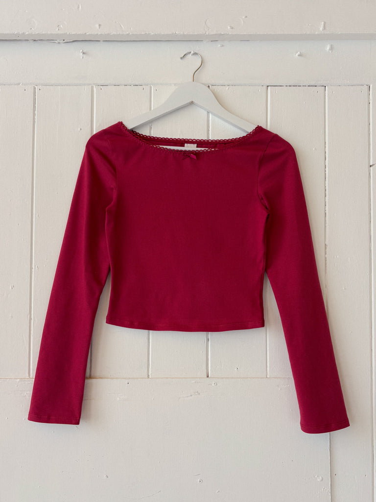 Soft, cosy, and easy to style. This burgundy long sleeve top is made from buttery soft, stretchy cotton jersey for a smooth, comfortable fit. Finished with matching lace trim and bow. Perfect with your favourite skirt or jeans. Ships in 2–3 working days.
